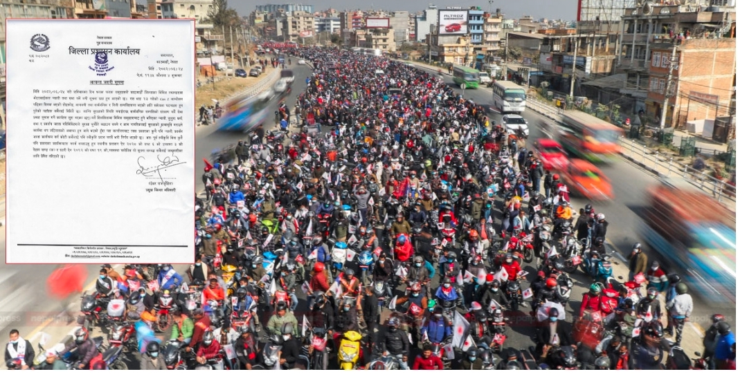 काठमाडौंका प्रमुख जिल्ला अधिकारी ईश्वरराज पौडेलले एक सूचना जारी गर्दै शनिबारका दिन फरक फरक समूहहरूले काठमाडौंका विभिन्न स्थानहरुमा मोटरसाइकल ऱ्याली तथा सभा गर्ने भनी सूचना आएको भन्दै र्याली, जुलुश, धर्ना, सभा र प्रदर्शनजस्ता गतिविधिले सुरक्षा चुनौती बढाउन सक्ने भएकाले कोही कसैलाई स्वीकृत नदिने प्रष्ट्याएका छन् ।