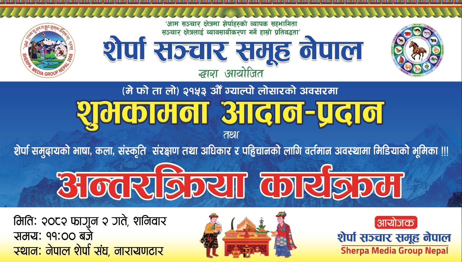शेर्पा सञ्चार समूह नेपालले मे फो त लो २१५३ औं ग्याल्पो लोसारको अवसरमा शुभकामना आदानप्रदान तथा अन्तरक्रिया कार्यक्रम आयोजना गर्ने भएको छ।