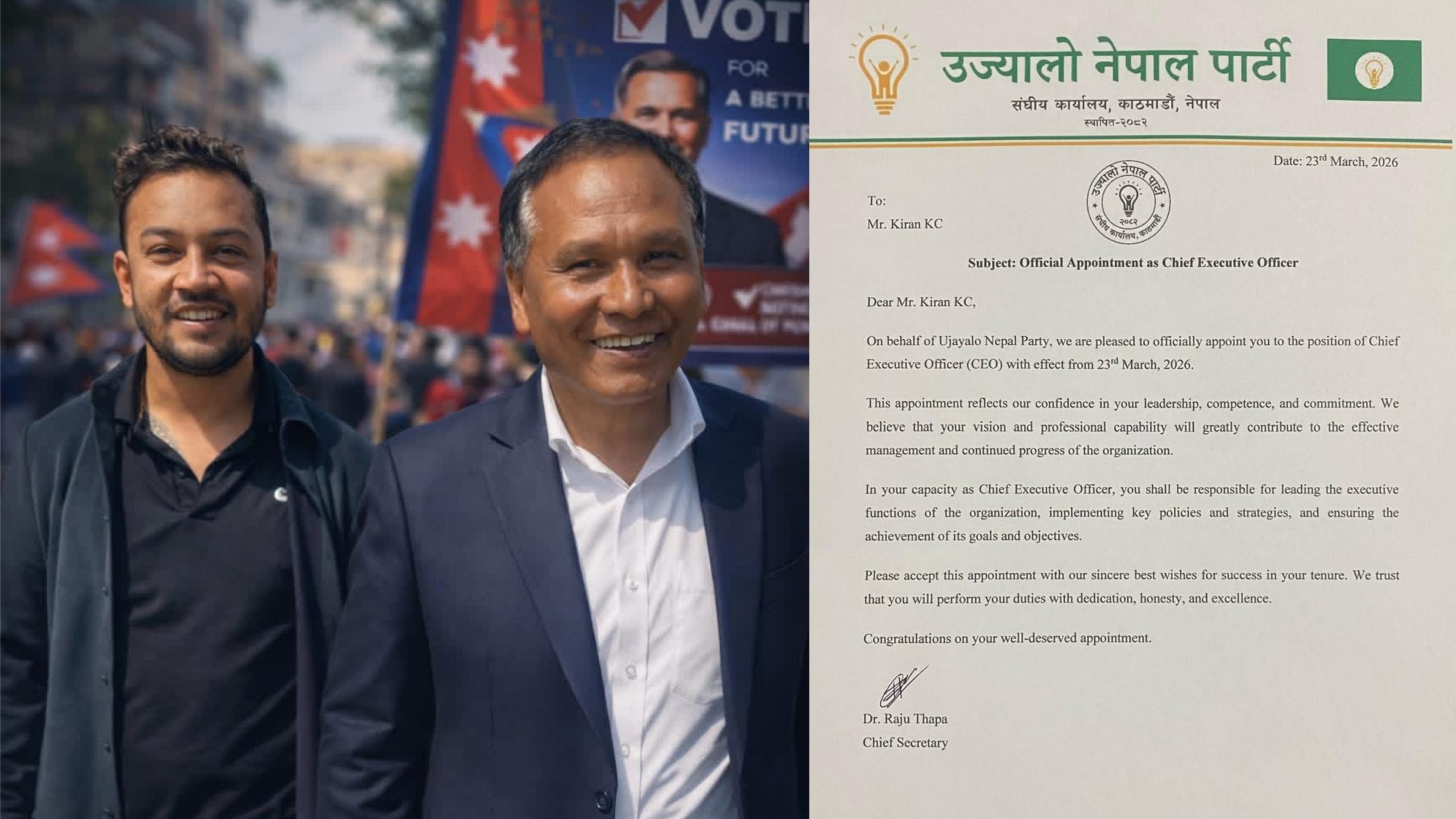 काठमाडौं, नेपाल — उज्यालो नेपाल पार्टीका केन्द्रीय समिति सदस्य इन्जिनियर किरण केसीलाई आज पार्टीको प्रमुख कार्यकारी अधिकृत (CEO) पदमा नियुक्त गरिएको छ। उक्त निर्णय आज सम्पन्न उच्चस्तरीय बैठकबाट औपचारिक रूपमा घोषणा गरिएको हो, जसले पार्टीको संगठनात्मक नेतृत्वलाई थप सुदृढ बनाउने अपेक्षा गरिएको छ।